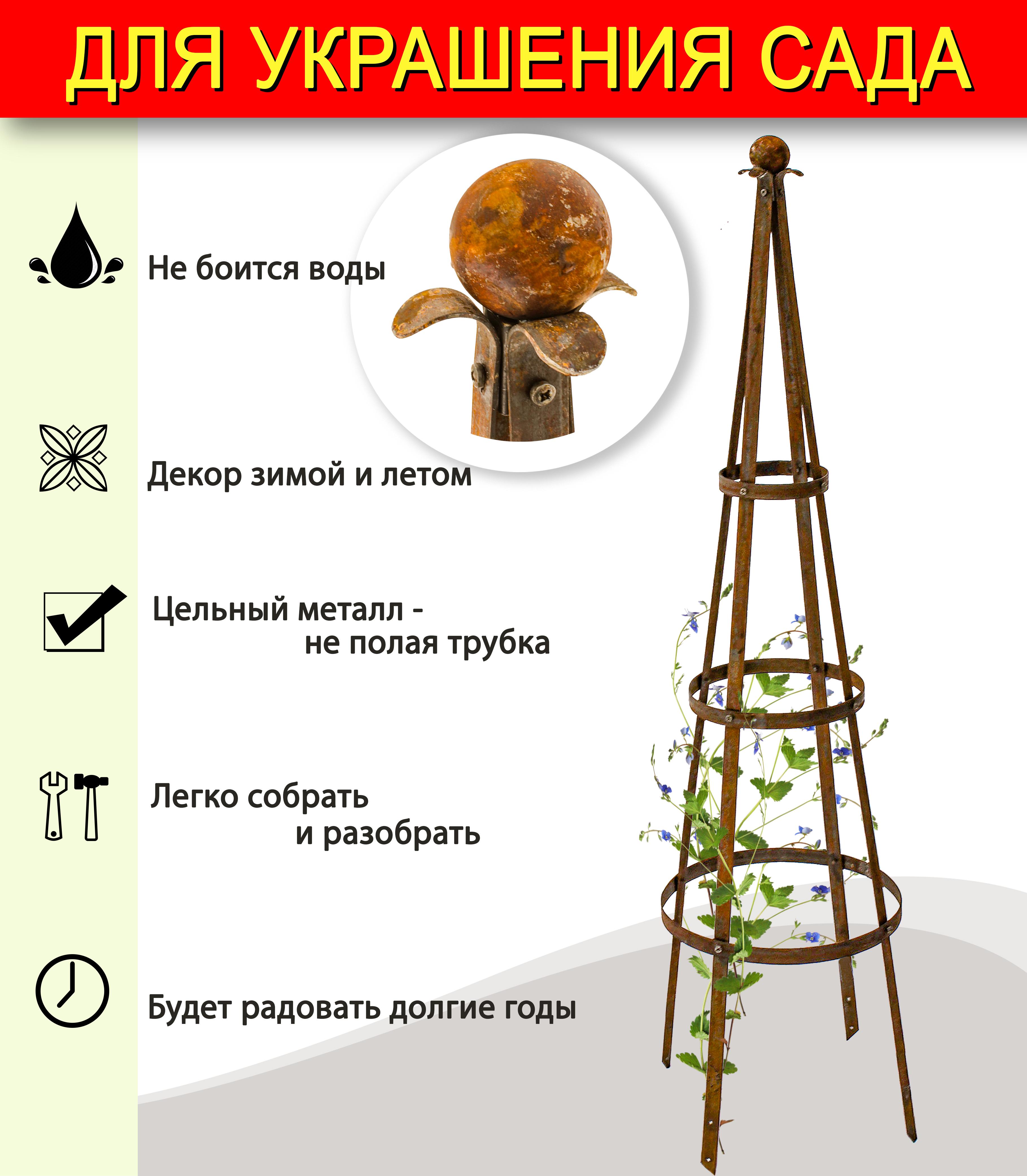 Садовый декор - Опора для вьющихся "Клематис" от Рео-Стил - это стильное и функциональное решение для садового дизайна. Изготовленная из стальной полосы 30х3 мм, опора обеспечивает высокую прочность и долговечность. Особенностью данной опоры / шпалеры / для растений является ее дизайн. Опора поставляется в неокрашенном виде, со временем металл поржавеет и покроется естественной "патиной". При желании опору можно покрасить краской по металлу Шпалера "Клематис" имеет высоту 180 см, что подойдет для большинства вьющихся растений Опора поставляется в разобранном виде, что облегчает ее транспортировку и установку. Сборка опоры занимает всего 10 минут, что делает ее удобной для использования даже новичками Выбирая декоративные шпалеры и опоры для кустов и вьющихся растений от Рео-Стил, вы получаете стильное и функциональное решение для вашего садового дизайна, которое прослужит вам на протяжении многих лет